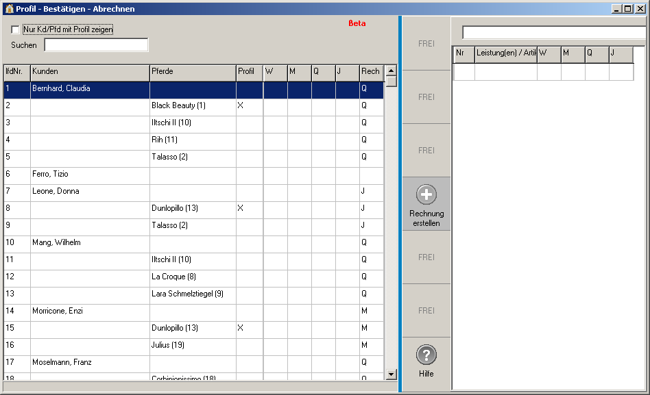 Adressen (Kunden, Reiter, etc.) und deren Pferde sind alphabetisch sortiert gelistet. Solche Adressen und Pferde, die ein Profil angelegt haben, sind mit "X" markiert. Daneben ist die zeitliche Spanne des Profils in der jeweiligen Spalte "W", "M", "Q" oder "J" gelistet.