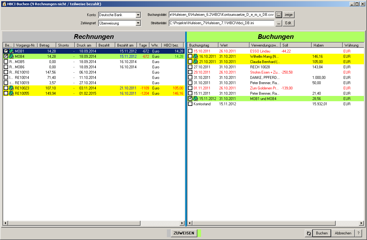 (= Aktualisieren) Rechnungen und Buchungen neu einlesen- [Buchen] Alle grün markierten Sätze permanent zuweisen (und speichern)